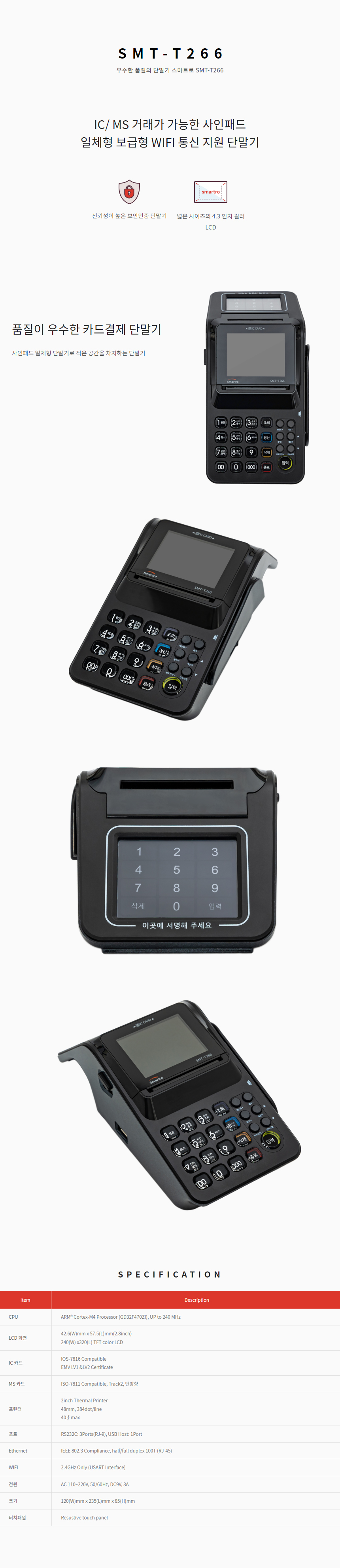 ★ 서명 패드 일체형 단말기 ★ 신용 IC(MS) / 현금 영수증 / 포인트 거래 ★ 2.8인치 컬러 LCD탑재 ★ 정보보호 기술 인증 단말기 ★ 다양한 통신 기능 ( 유선전화 .인터넷 .와이파이 .핫스팟 연결 기능) ★ TMS 기능