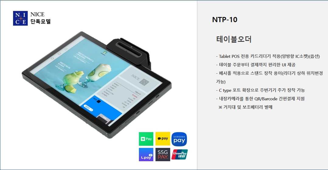 ★ Tablet POS 전용 카드리더기 적용(양방향 IC소켓)(옵션) ★ 테이블 주문부터 결제까지 편리한 UI 제공 ★ 베사홀 적용으로 스탠드 장착 용이(리더기 상하 위치변경 가능) ★ C type 포트 확장으로 주변기기 추가 장착 가능 ★ 내장카메라를 통한 QR/Barcode 간편결제 지원