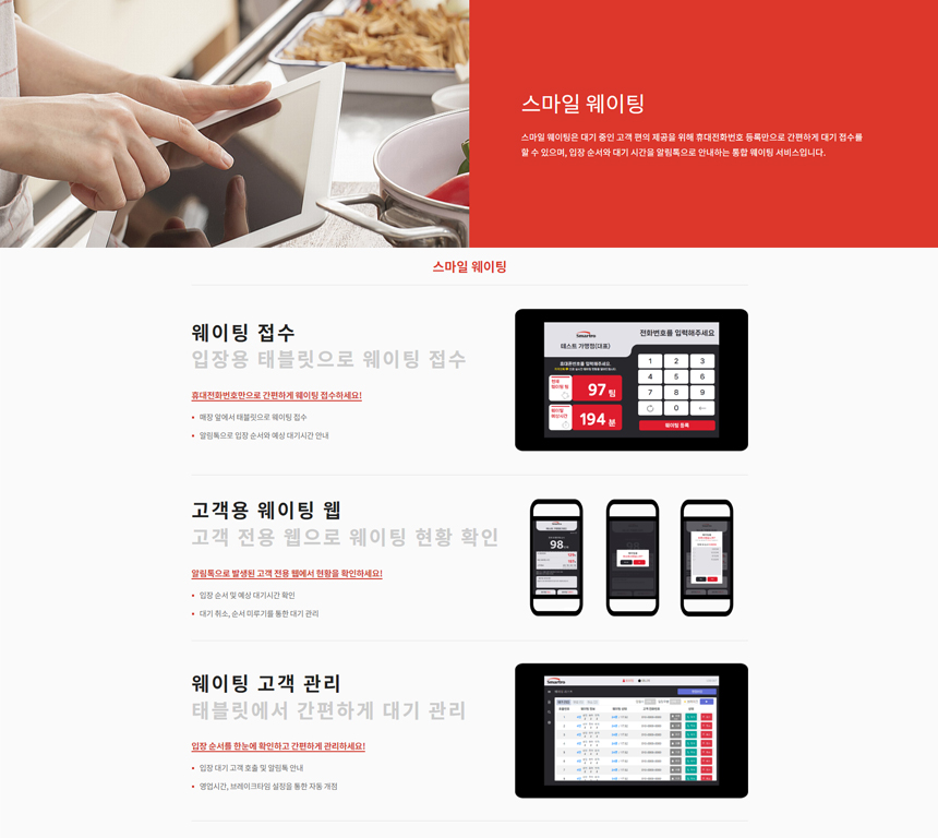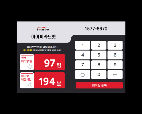 ★ 스마일웨이팅 은 대기 중인 고객 편의 제공을 위해 휴대전화번호 등록 만으로 간편하게 대기 접수를 할 수 있으며, 입장 순서와 대기 시간을 알림톡 으로 안내하는 통합 웨이팅 서비스입니다. ★ 웨이팅 접수 (입장용 테블릿으로 웨이팅 접수) ★ 고객용 웨이팅 앱 (고객 전용 웹으로 웨이팅 현황 확인 ★ 웨이팅 고객관리 (태블릿에서 간편하게 대기 관리)